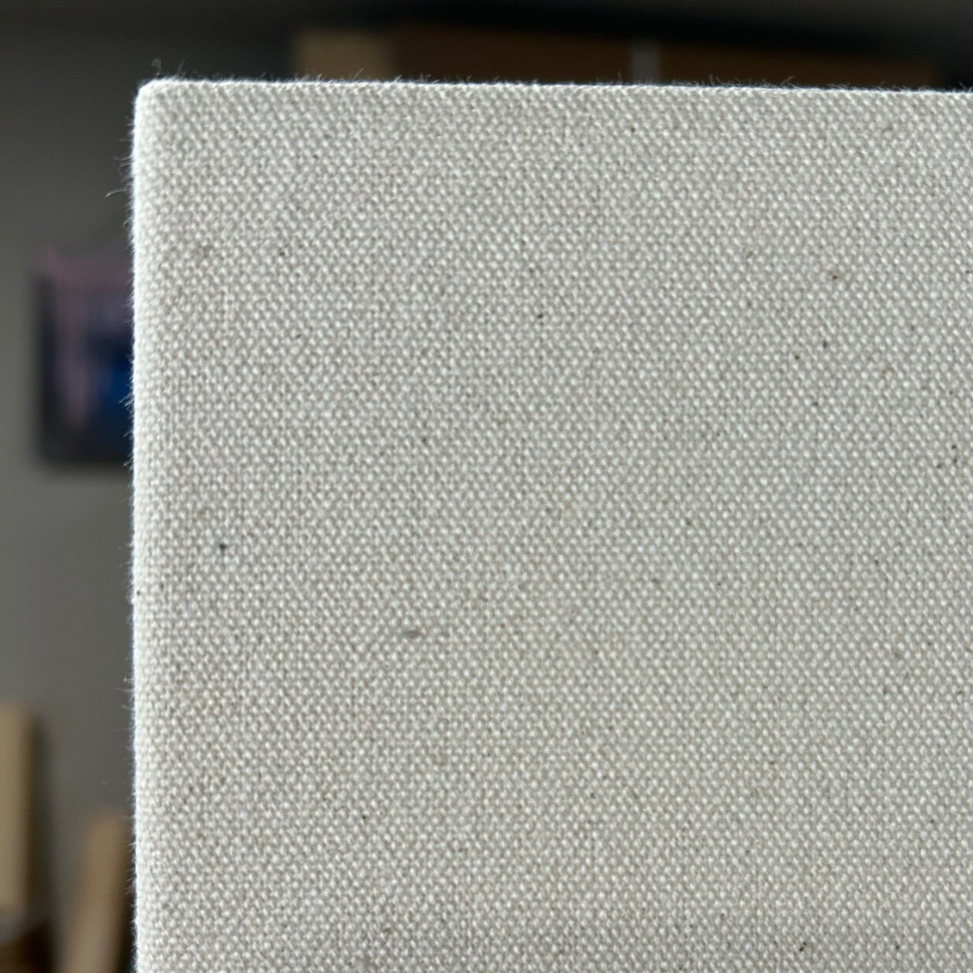 12 oz cotton canvas, unprimed (raw). Double weave and strong to take on many techniques. Oil painters should size the surface with PVA size before priming the canvas to lock in the fibers and prevent wicking of the oil through the canvas.